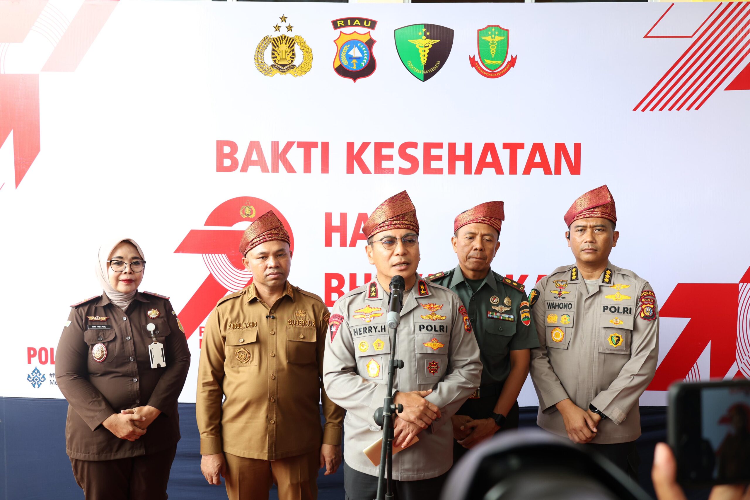 Bakti kesehatan ini dihadiri langsung oleh Kapolda Riau Irjen Pol Dr. Herry Heryawan, SIK, MH, M.Hum, Wakapolda Riau Brigjen Pol Jossy Kusumo, SH, M.Han, Gubernur Riau Abdul Wahid, Ibu Ketua Bhayangkari Polda Riau beserta pengurus Bhayangkari, serta Para Pejabat Utama Polda Riau.